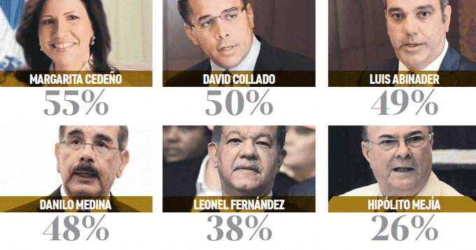 Por David Collado se expresó de manera favorable el 50% de los consultados y el 27% dijo que no lo consideraría a la hora del voto. Luis Abinader registró un 49% a favor y 39% en contra. El presidente Danilo Medina marcó un 48% a favor y 43% que no le consideraría.