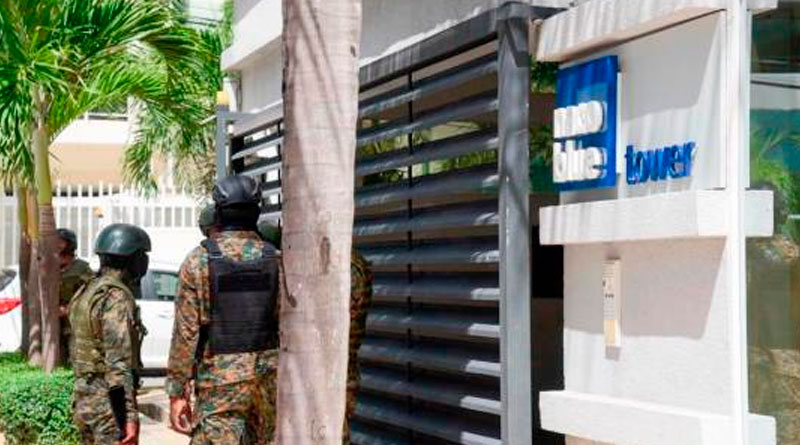 Un contingente militar y de la Dirección Nacional de Control de Drogas (DNCD) custodia la entrada de la torre, ubicada en la calle Fabio Mota, número 29.