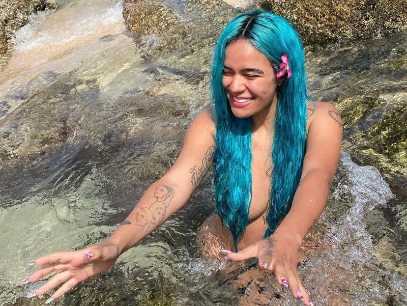 La «Bichota», como es denominada, se describió a sí misma como La Sirenita con su cabello azul y entre las pequeñas rocas de la playa, donde aprovechó para cubrirse y así subir las imágenes a las redes sociales, además de taparse con el largo del cabello.