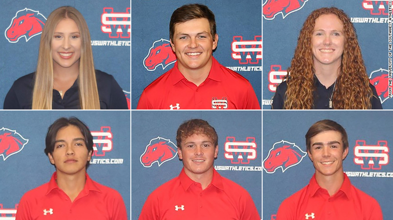 Los seis estudiantes deportistas de la USW fallecidos en un accidente el martes fueron identificados como (fila superior, de izquierda a derecha) Laci Stone, Jackson Zinn, Karisa Raines, (fila inferior, de izquierda a derecha) Mauricio Sánchez, Travis García y Tiago Sousa.