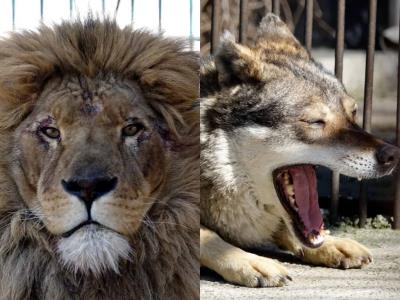 El león y el lobo gris, ambos machos adultos y que estuvieron completamente despiertos durante el peligroso viaje debido a una escasez de tranquilizantes en Ucrania, llegaron el lunes a un zoológico de Radauti, procedentes de un zoo en Zaporizhzhia, en el sureste de Ucrania.