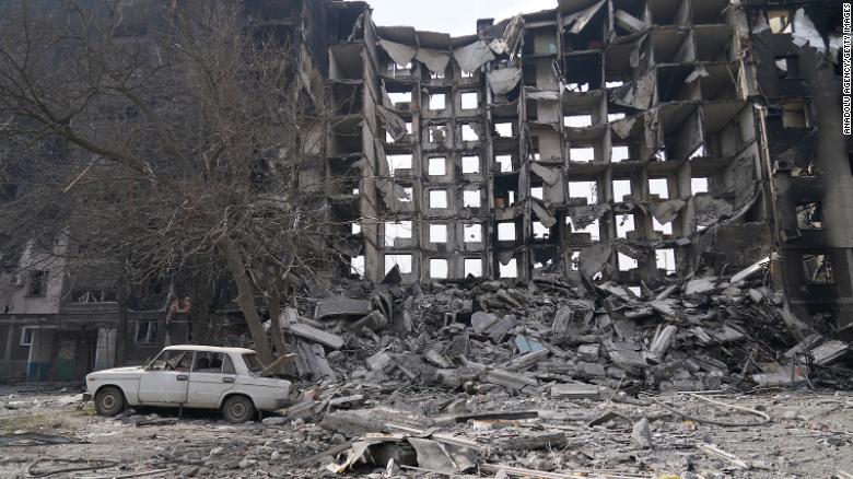 Esta fotografía muestra un edificio derrumbado mientras los civiles son evacuados a lo largo de los corredores humanitarios de la ciudad ucraniana de Mariúpol.
