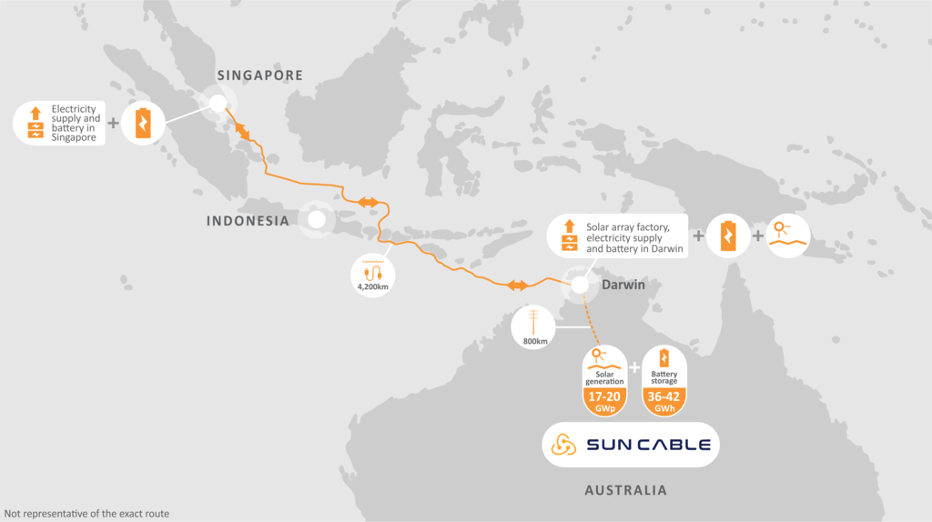 De la energía transportada, unos 800 megavatios de desviarán para reforzar el suministro eléctrico de los hogares y negocios de Darwin y el resto viajará a lo largo de un tendido submarino con tres cables que recorrerán 4.200 km y pasarán por Indonesia hasta llegar a Singapur.