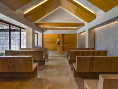 Dentro, Brown hizo una destilación de los elementos necesarios en las capillas: desde los bancos en roble que evocan la silla Zig-Zag de Rietveld hasta los techos a dos aguas con terminación en microcemento y bloques tridimensionales de la misma madera de los asientos —hay un reflejo en el cielo de la tranquilidad que se percibe en la Tierra—. En vez de colocar piezas de arte con referencias religiosas, las fotografías elegidas comunican tranquilidad a través de tomas de elementos naturales como el agua. En el espacio sonoro —que también ha diseñado Brown— se escucha el cantar sutil y armonioso de una selección de aves. Finalmente, las vetas del Calacatta están presentes en las elegantes caras de los columbarios, algunos en el exterior, otros en el interior y otros más en el impresionante espacio liminal que se logró en un salón semi-cerrado con un techo de vidrio. “Puedo decir, por experiencia propia, que despedir a un ser querido lleva el sello de algo cruel, duro y gris”, explicó Brown. “A mí me apasiona el tema del poder emocional del diseño de interiores, y quería transformar esa experiencia en otro tono, para que en vez de trauma deje tranquilidad”.