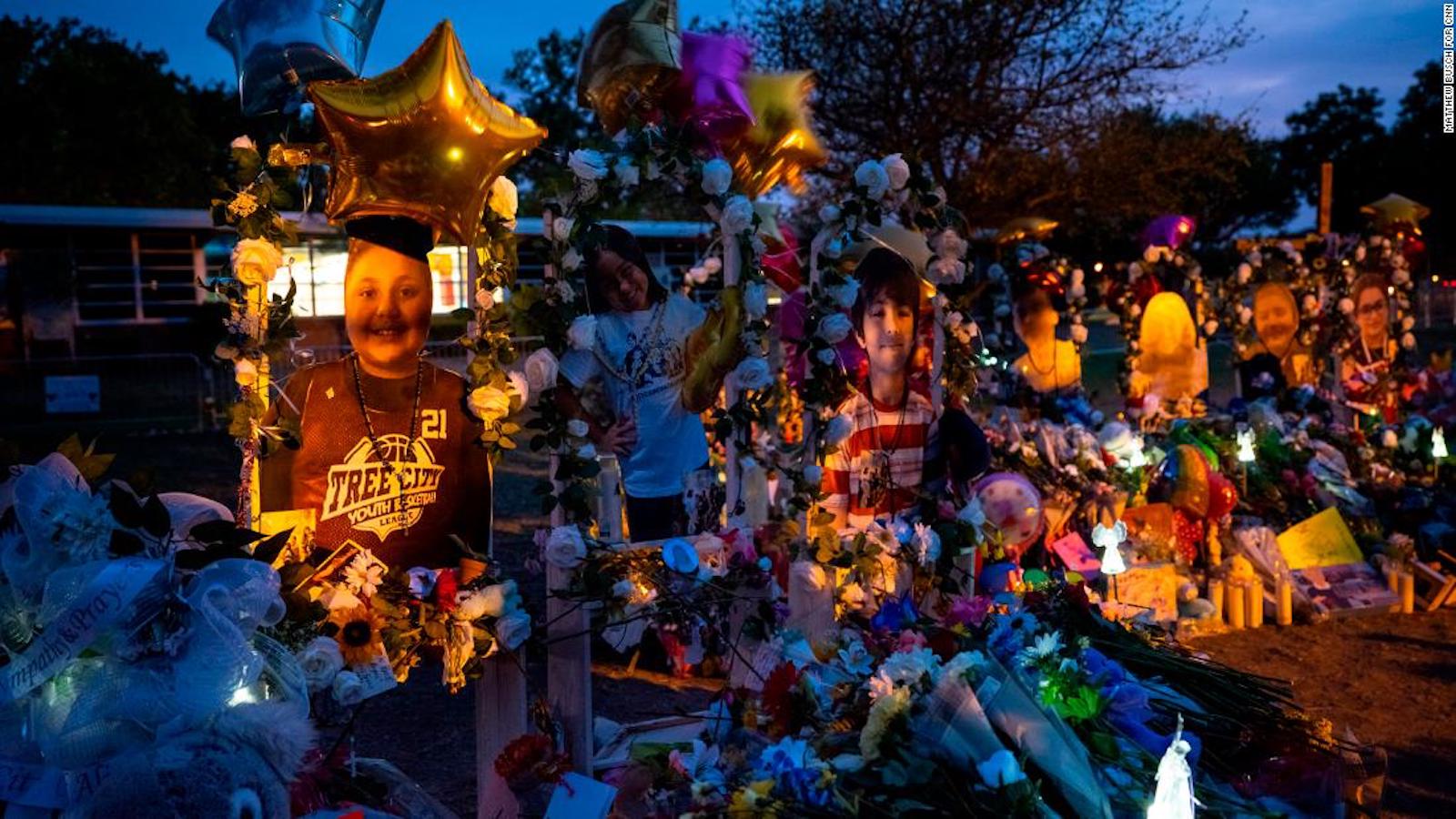 (CNN) — Bajo un cielo azul y cálido en el sur de Texas, una fuente del parque en una plaza de la ciudad bañada por el sol es la pieza central de un monumento cada vez mayor que honra a los muertos en el tiroteo masivo escolar más mortífero en suelo estadounidense en casi 10 años.