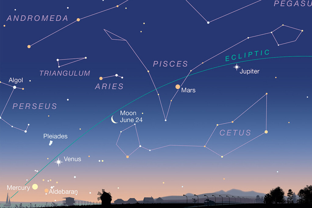 Los cinco planetas que son visibles al ojo humano (Mercurio, Venus, Marte, Júpiter y Saturno) estarán presentes en los crepúsculos de las noches de este mes de junio. Los planetas irán apareciendo en orden inverso por el este, ligeramente por debajo de la línea eclíptica. El último en aparecer será mercurio.