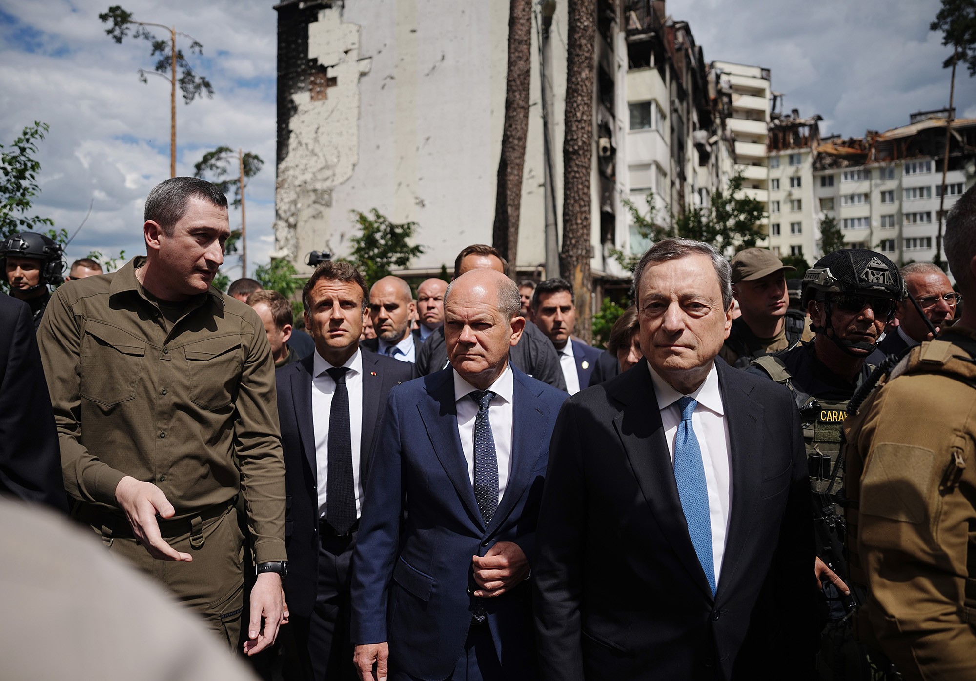 El presidente de Francia, Emmanuel Macron; el canciller de Alemania, Olaf Scholz, y el primer ministro de Italia, Mario Draghi, viajaron a la ciudad en tren, confirmó este jueves el Palacio del Elíseo.