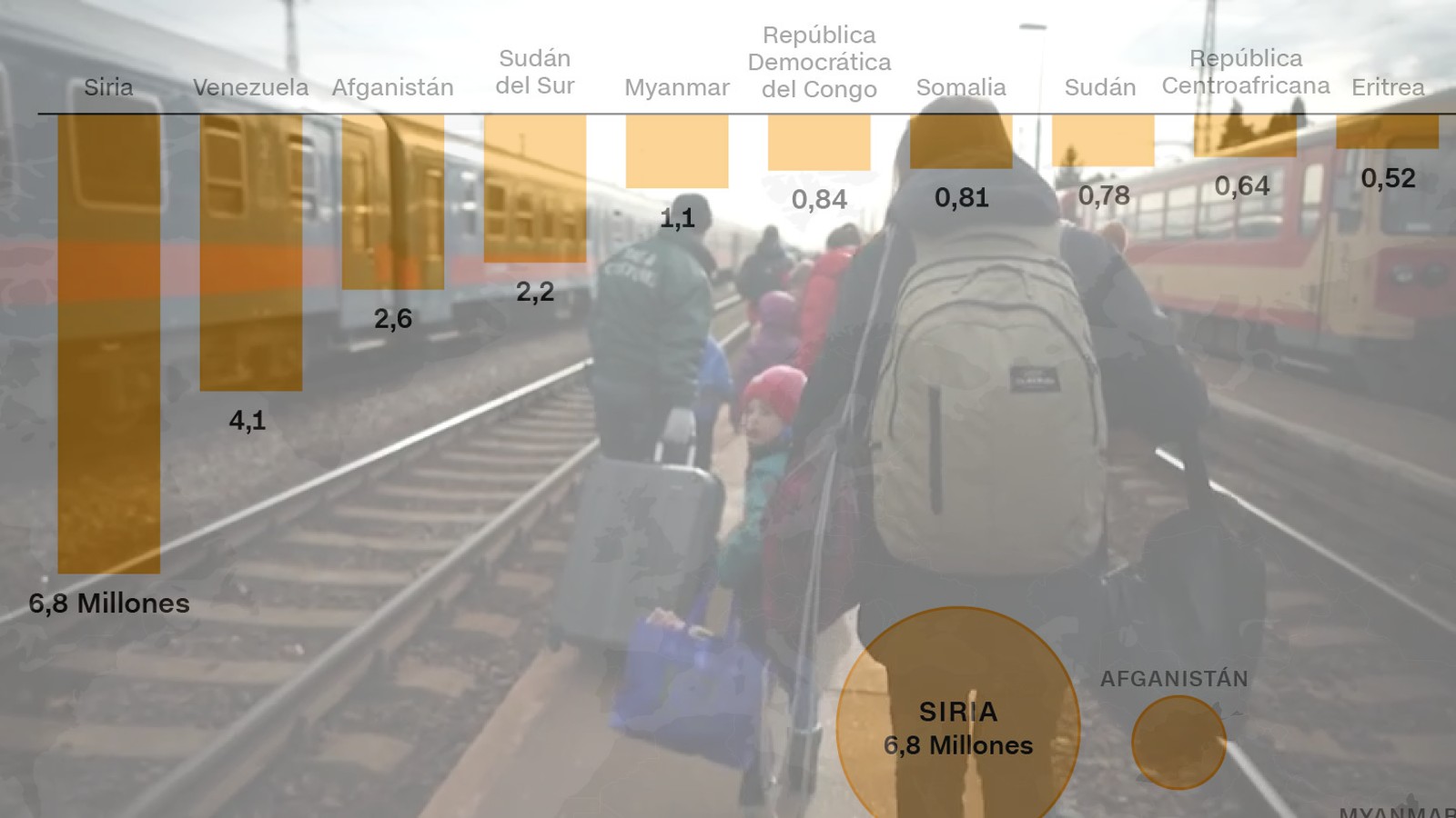 El 68% de los refugiados en el mundo provienen de apenas cinco países, según datos de Acnur. Se trata de Siria (6,8 millones), Venezuela (4,1 millones), Afganistán (2,6 millones), Sudán del Sur (2,2 millones) y Myanmar (1,1 millones).