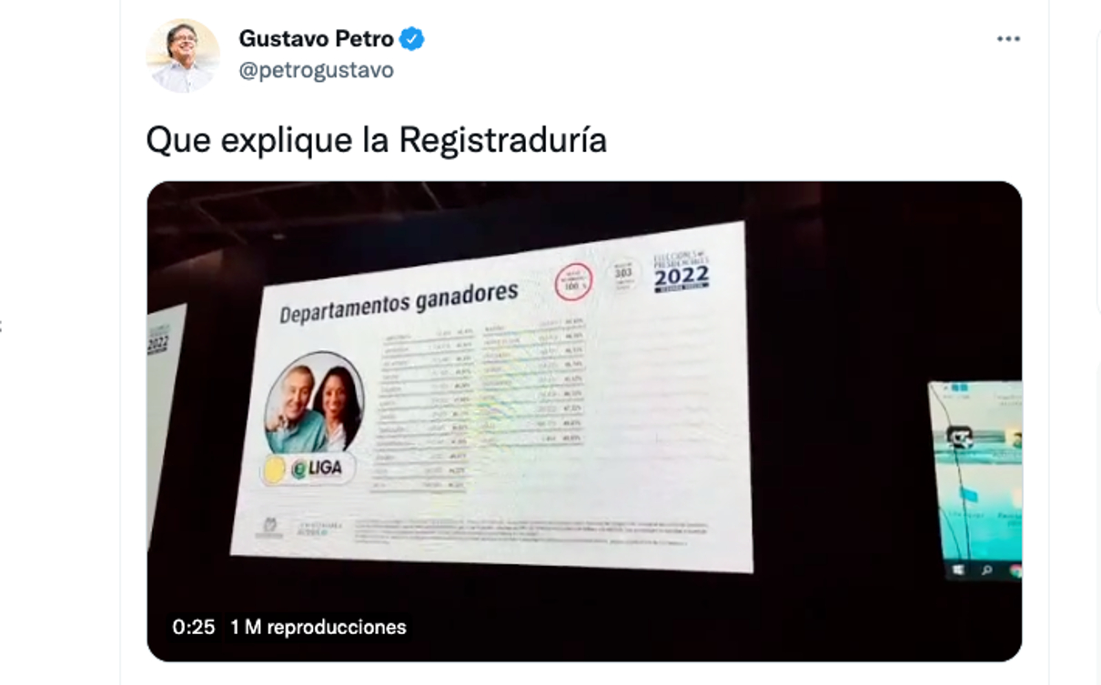 (CNN español) — En las últimas horas usuarios en Twitter señalaron que unos resultados no reales de la Registraduría sobre las elecciones en Colombia se habían hecho visibles. En la noche del viernes 17 de junio el candidato presidencial Gustavo Petro publicó un video en sus redes sociales con el texto «Que explique la Registraduría» en el que se veía una plataforma con lo que parecen ser datos de prueba o de una simulación de resultados por departamentos para la segunda vuelta, datos que se podían ver también reflejados desde el viernes en un widget de hace tres semanas publicado por CNN. Aunque la Registraduría dice que no se hacen simulacros, un magistrado del Consejo Nacional Electoral le aseguró a CNN que a él le confirmaron que un contratista hizo una simulación.
