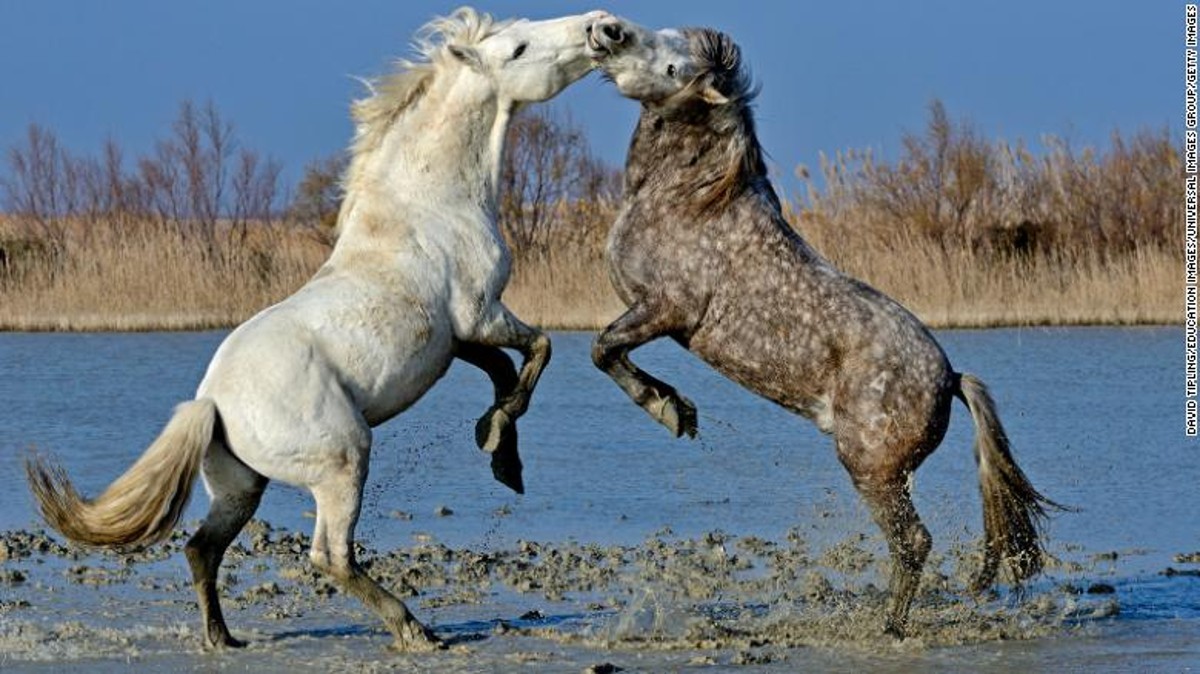 Los sementales pelean en un pantano en la región de Camargue de Provenza en Francia.