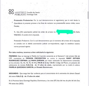 “Que se imponga la Medida de Coerción contenida en el numeral 7, del artículo 226 del CPP, consiste en PRISION PREVENTIVA en contra la imputada MARIA ESTHER RODRIGUEZ ESPINAL (a) MAMI JORDAN, por haber violentado las disposiciones contenidas en los artículos 12, 13, 14, 15, 16 18 y 396-B de la ley 136-03. Código del Menor, en perjuicio del adolescente de iniciales R.A.C.Q., de 15 años de edad., representado por su madre la señora PAMELA QUEZADA GARCIA y el Estado Dominicano”, cita el comunicado.
