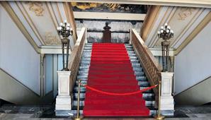 En la entrada se visualiza la escalinata de mármol en la que resaltan dos imponentes leones en bronce. Ajustado con columnas deslumbrantes, resaltan sus tres niveles.