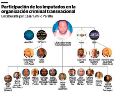 Entra los imputados en la red de Peralta figuran Melchor Antonio Alcántara Damirón, empresario de la construcción; Genri Daniel Santana Badía, Jhonan Alexander Ureña Martínez, Biancis Evangeline Castellanos Miranda, Reynaldo Alberto Canela, y Ramón Reinaldo Guerra Molina.