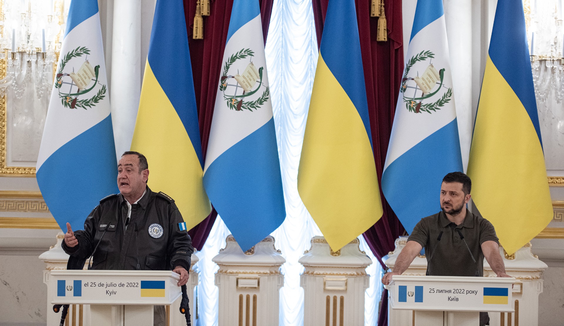 El presidente de Ucrania, Volodymyr Zelensky y el presidente de Guatemala, Alejandro Giammattei en una conferencia de prensa conjunta el 25 de julio de 2022, en Kyiv, Ucrania. Crédito: Alexey Furman/Getty Images