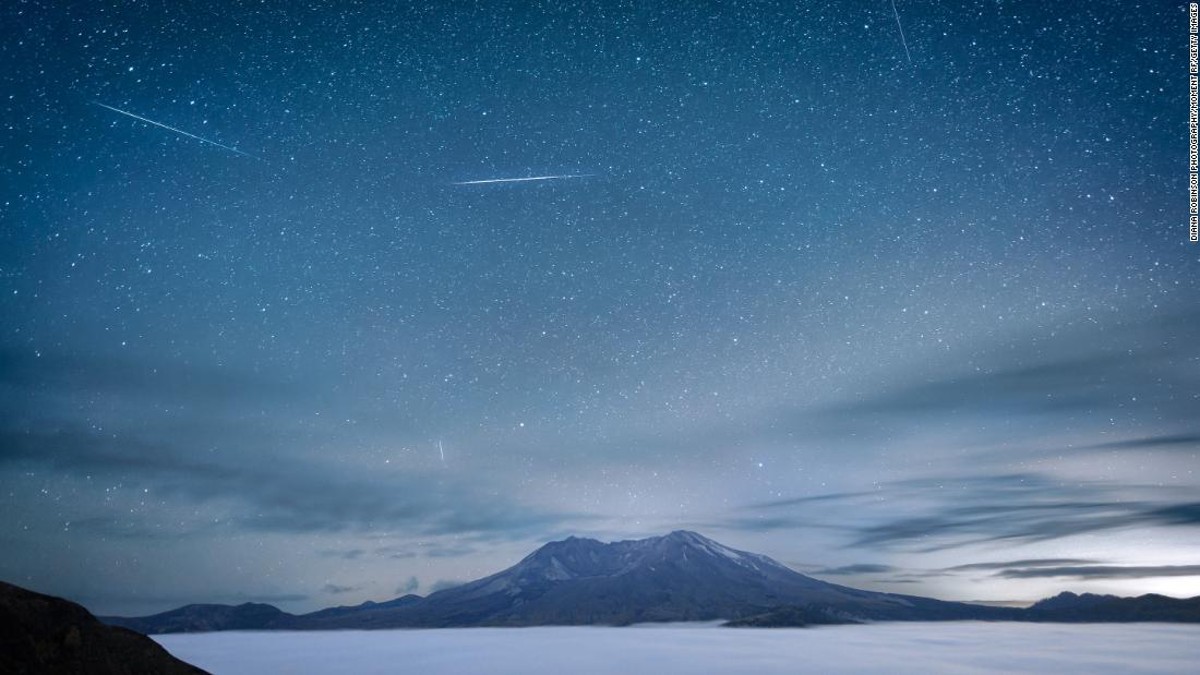En la imagen se muestra una lluvia de meteoros delta acuáridas pasada que se produjo alrededor de las 2 a.m. sobre el monte St. Helens en el estado de Washington.