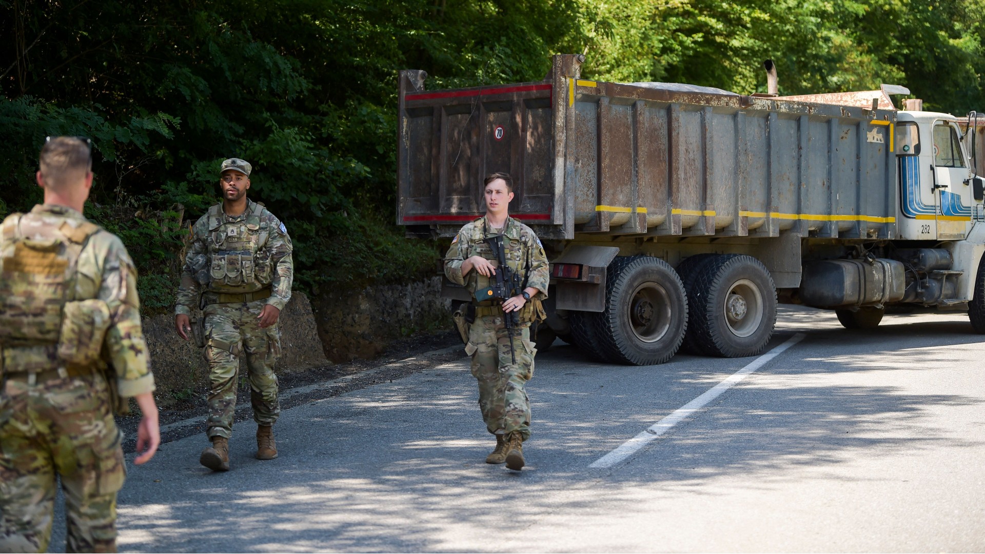 Soldados estadounidenses que prestan servicio en la fuerza de la OTAN en Kosovo patrullan junto a una barricada levantada por personas de etnia serbia en la ciudad de Zubin Potok el 1 de agosto de 2022. (Crédito: ARMEND NIMANI/AFP vía Getty Images)