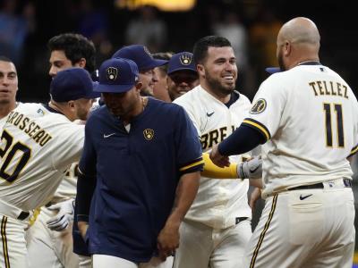 Victor Caratini pegó un sencillo de dos carreras ante el cerrador de los Dodgers Craig Kimbrel en el 11mo inning y selló una remontada de los Cerveceros de Milwaukee, que se impusieron 5-4 el martes a Los Ángeles.
