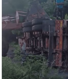 Al menos un herido tras volcarse un camión cargado de asfalto la mañana de este martes, alrededor de las 6:00 de la mañana, entre el distrito municipal Quita Sueño y Piedra Blanca de la carretera Sánchez.
