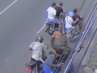 Dos de los seis antisociales se acercan al señor una vez se detiene y cuatro más, en dos motocicletas, se detienen delante.