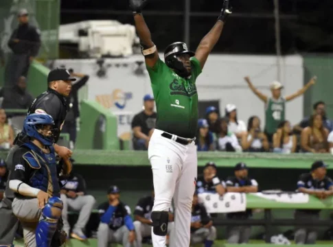 Las Estrellas Orientales celebran el jonrón de Sandber Pimentel en el triunfo 5-4 la noche del sábado sobre los Tigres del Licey en el Estadio Tetelo Vargas.
