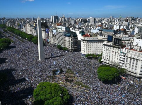Cientos de miles de hinchas con camisetas de la Selección nacional y banderas se concentran en el Obelisco, en pleno centro porteño, a la espera de los campeones del mundo.
