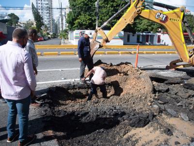 Una brigada fue enviada al lugar desde las primeras horas de este martes y, de inmediato, comenzó a perforar el pavimento para descubrir la tubería causante de la fuga que causó un hoyo que impactaban los vehículos que transitan hacia el sur de la Gasett.