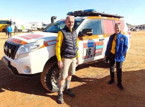 -M. Es el único rally que circula en la pista con la competición, a diferencia de otros en los hay ambulancias en puntos geográficos. Acá seguimos la competencia día y noche. Normalmente la atención durante el día, cuando hay luz, la suele hacer el traslado en helicóptero, pero a partir de que cae el sol y los helicópteros no pueden volar, todo lo que queda rondando en la pista es seguido por las ambulancias (son vehículos 4×4 con equipamiento) que están circulando con la competición. Depende de la cantidad de pilotos que sigan en carrera toda la noche. Hacer un Dakar en un lugar en el que es invierno, cuando la luz termina a las cinco y pico de la tarde, implica que nuestros vehículos sigan a toda la competición, toda la noche.