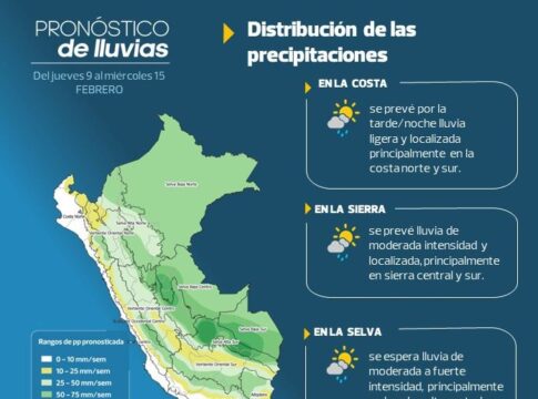 Del 9 al 15 de febrero, en costa norte y sur se prevé lluvia ligera y localizada durante la tarde y la noche. En la sierra centro y sur se espera lluvia de moderada intensidad y localizada. Y en selva centro y sur lluvia de moderada a fuerte intensidad.