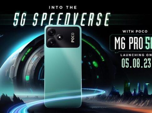 El anuncio muestra el Poco M6 Pro 5G con una isla de cámara rectangular que cuenta con dos sensores de cámara trasera y un flash LED y la marca de Poco. También se puede ver que el teléfono cuenta con el botón de encendido y el botón de volumen en el perfil derecho, nada del otro mundo.
