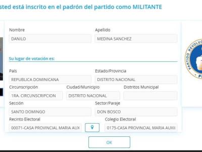 Al introducir en el «crm» del PRM el número de cédula y fecha de nacimiento del exmandatario, aparecía el siguiente mensaje: “Felicidades, usted está inscrito en el padrón del partido como militante”.