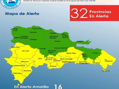 Tan pronto el Centro de Huracanes de los Estados Unidos elevó de categoría a la tormenta tropical Franklin, el Centro de Operaciones de Emergencia (COE) colocó 16 provincias en alerta amarilla y 16 en verde debido a los efectos de ese fenómeno natural que viene en dirección a República Dominicana, a unos 75 kilómetros por hora.