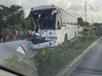 Se registró la tarde de este lunes un accidente entre un autobús de transporte hotelero con un camión que llevaba empleados del sector construcción en la avenida Circunvalación Verón-Bávaro