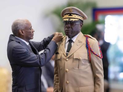 El presidente del Consejo Presidencial de Transición en Haití, Edgar Leblanc Fils, otorgó el grado de teniente general a Derby Guerrier con motivo de su toma de posesión como nuevo comandante en jefe de las Fuerzas Armadas.
