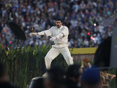 El Conejo Malo alborotó con su éxito «Tití me preguntó» el estadio Levi’s, con espacio para unos 75.000 espectadores, que cambió su grama por una plantación de caña, con carritos de comida, al más puro estilo latino.