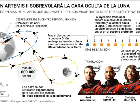Pero la misión no apunta directamente a la Luna. Antes, la nave se colocará en una órbita alta alrededor de la Tierra, donde pasará unas 24 horas comprobando que todo funciona: los astronautas tomarán el control manual durante un par de horas, testearán los sistemas de navegación y pondrán a prueba el soporte vital en condiciones reales. También simularán maniobras clave, como un acoplamiento, que serán esenciales en futuras misiones.