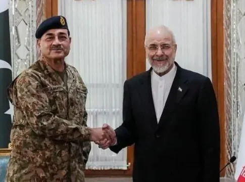 El presidente del Parlamento iraní ha surgido como un negociador clave; aquí se lo ve recibiendo la semana pasada al jefe del Ejército de Pakistán, Asim Munir.